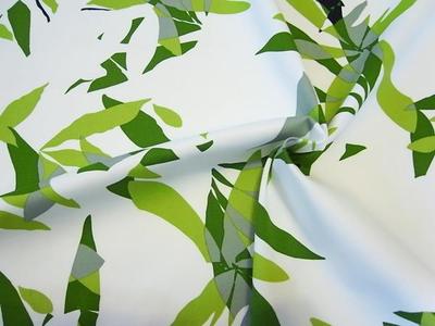 白地にグリーンの色使いでモダンで大胆な柄行がプリントされています。