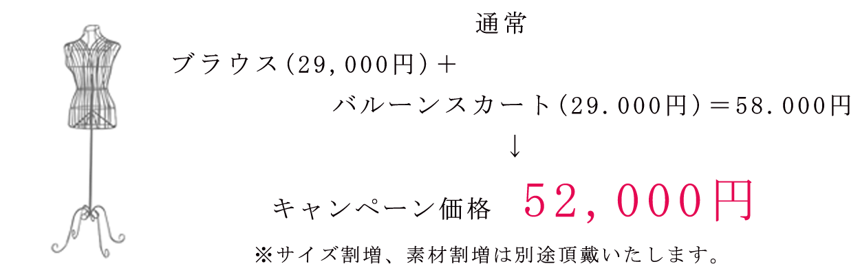 写真のブラウスはシルク素材を使用しておりますので素材割増で+10.000円となります。