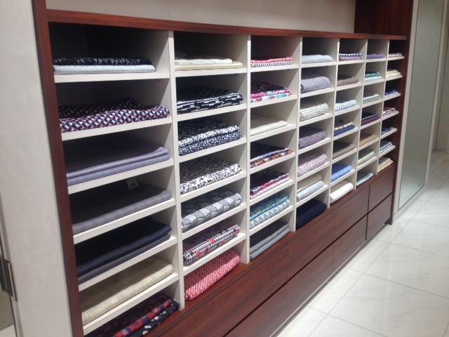 中には厳選したインポートの生地が棚に陳列されています。基本的にはスーツ着分(2.5m~2.7m)でカットされています。